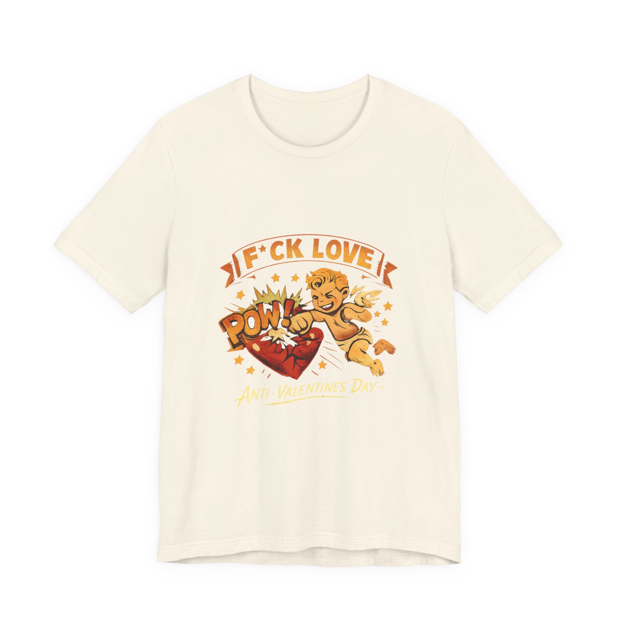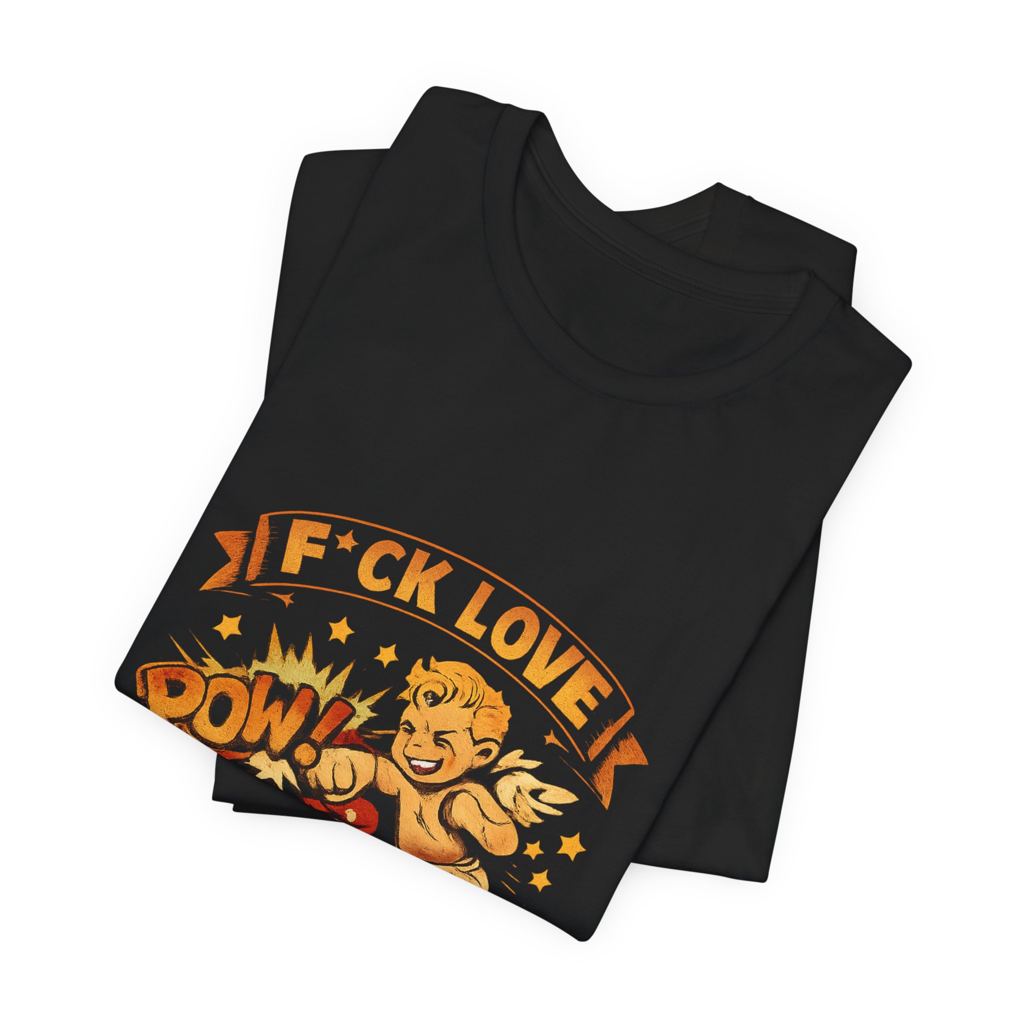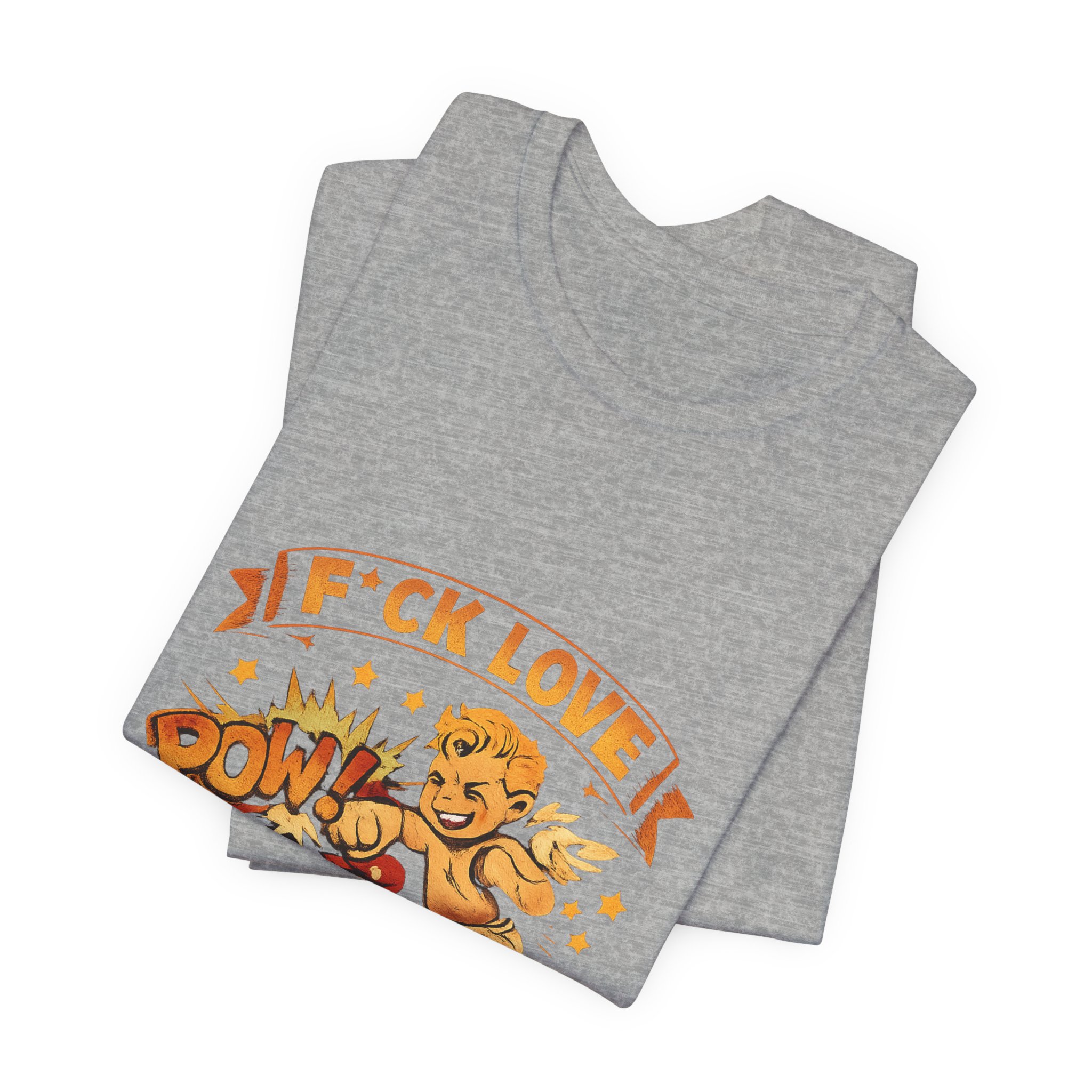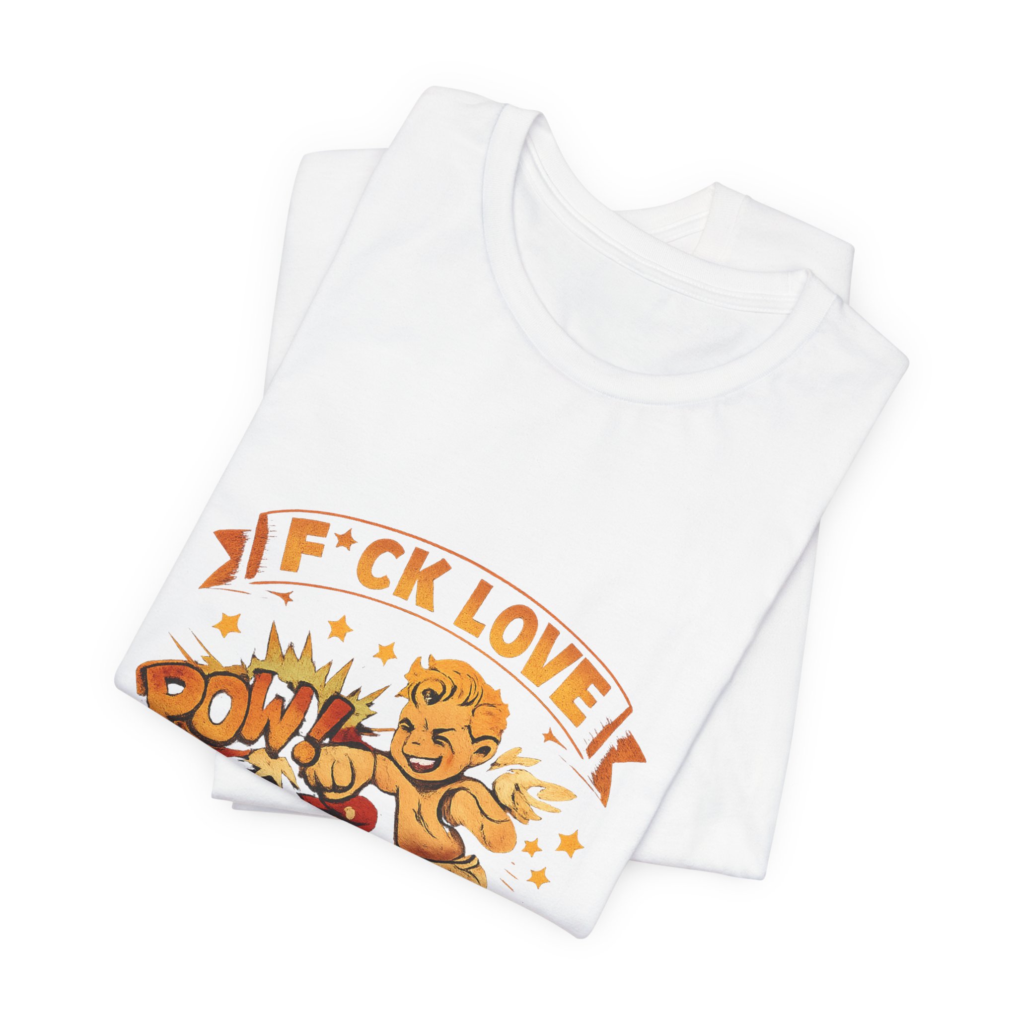 A satirical tee riffing on Modern Apocalyptic Humor: a vintage-style cherub smashing a heart with comic-book ‘POW’ energy, rendered in stark neutrals and warning orange accents. The design turns doomscroll tension into gallows levity—bold, utilitarian typography echoes alert graphics while the retro illustration softens the mood. Wear it to wink at cultural collapse and join a community that processes anxiety through ironic resilience.