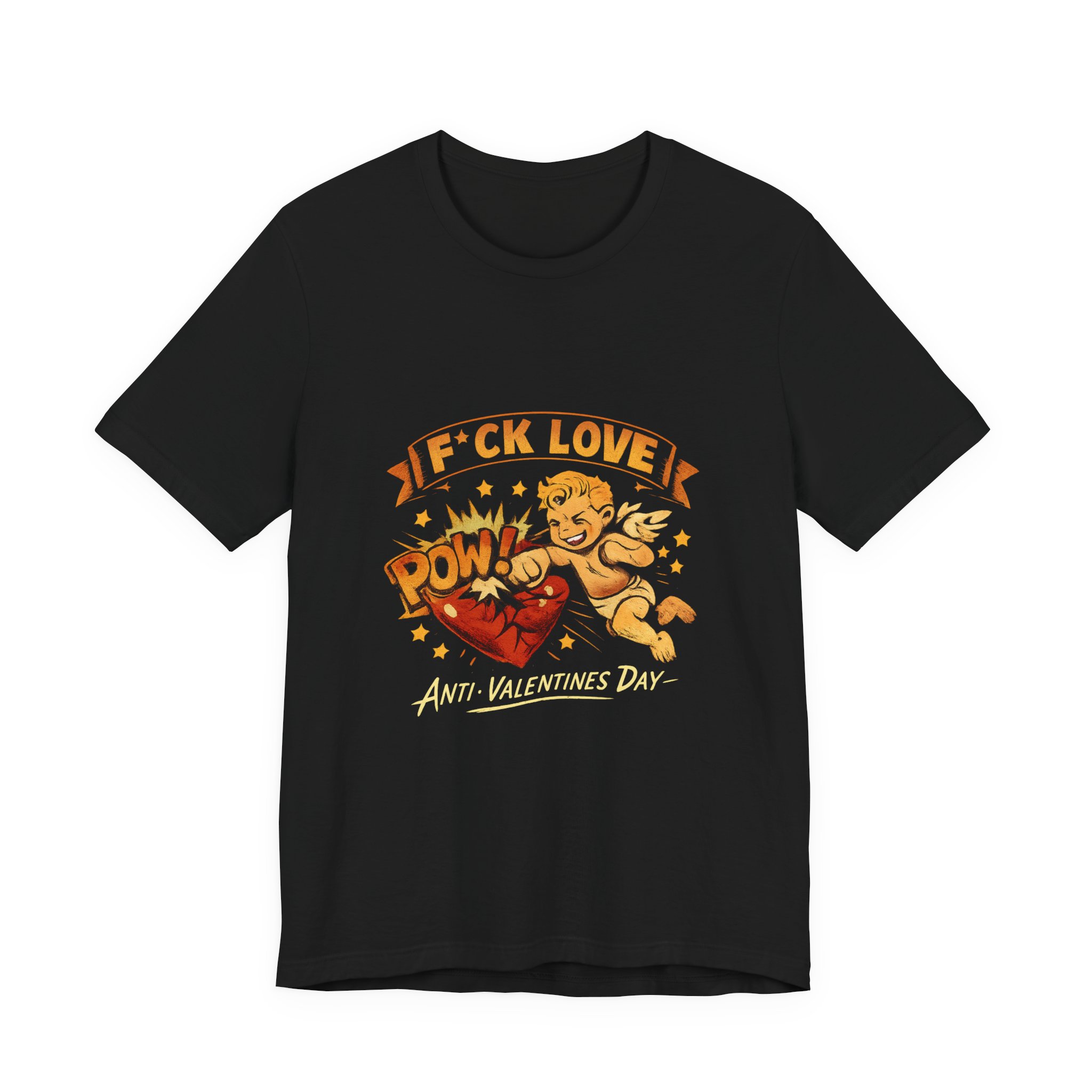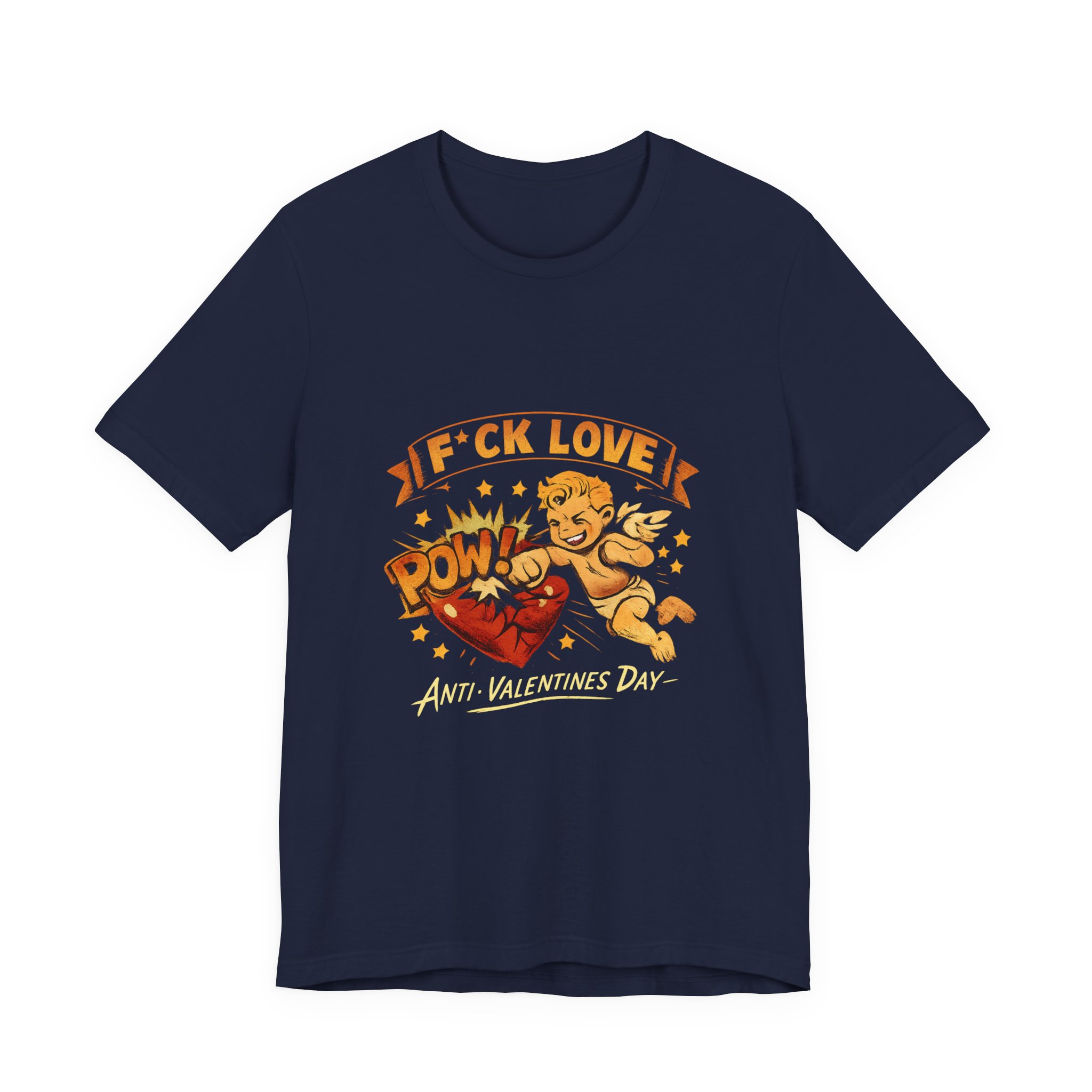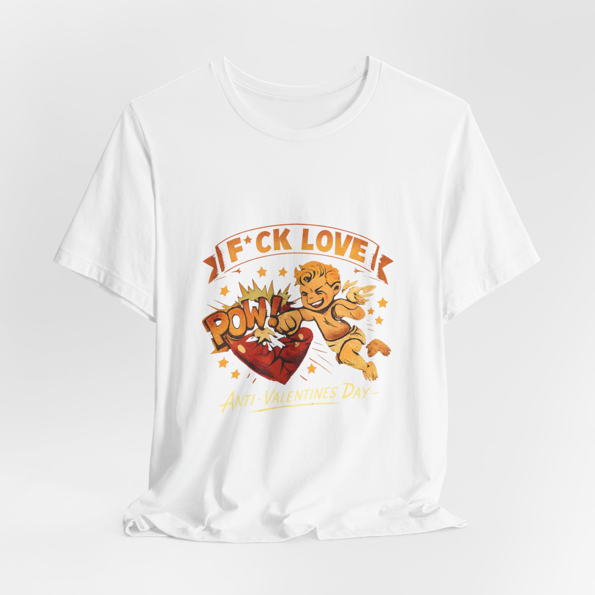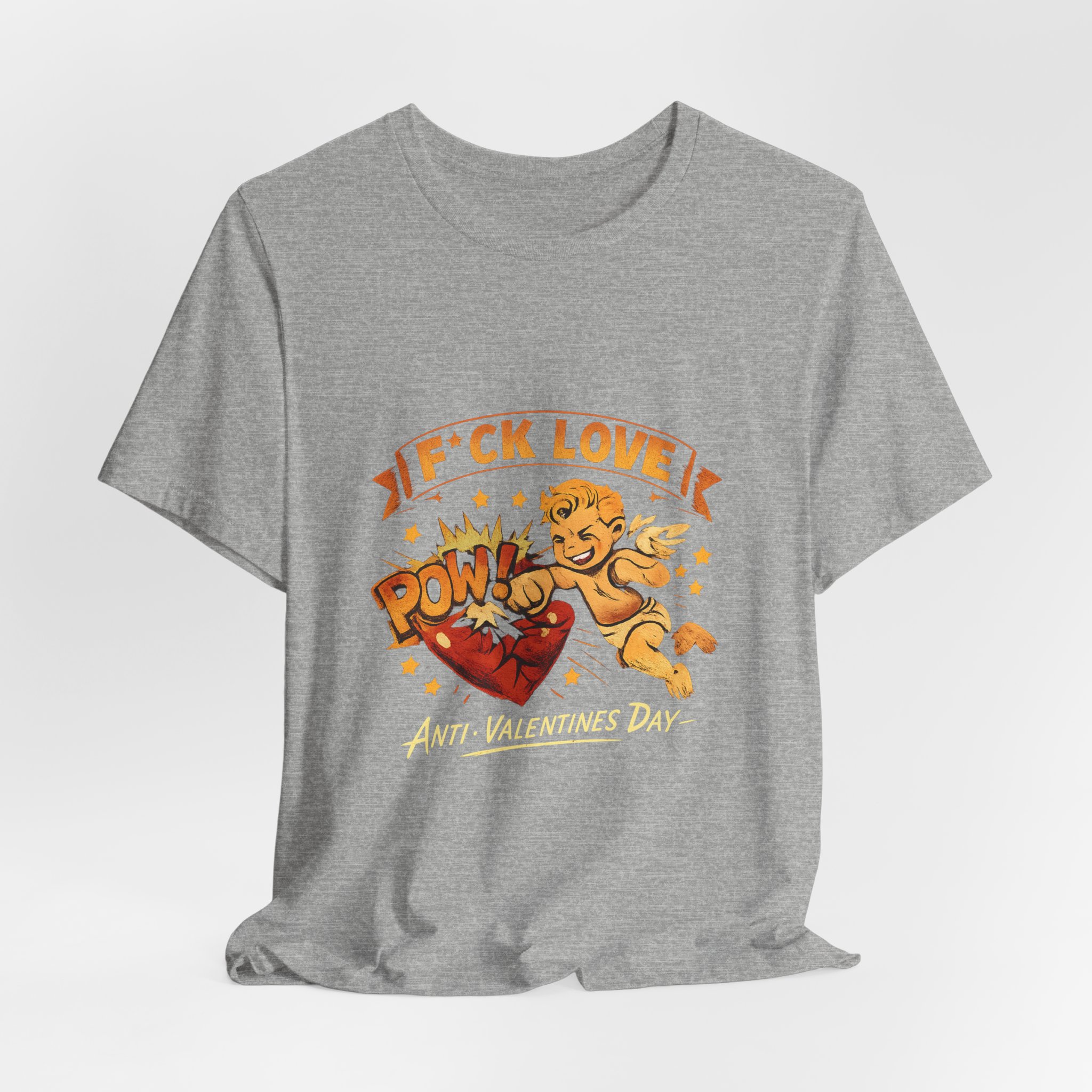 A satirical tee riffing on Modern Apocalyptic Humor: a vintage-style cherub smashing a heart with comic-book ‘POW’ energy, rendered in stark neutrals and warning orange accents. The design turns doomscroll tension into gallows levity—bold, utilitarian typography echoes alert graphics while the retro illustration softens the mood. Wear it to wink at cultural collapse and join a community that processes anxiety through ironic resilience.