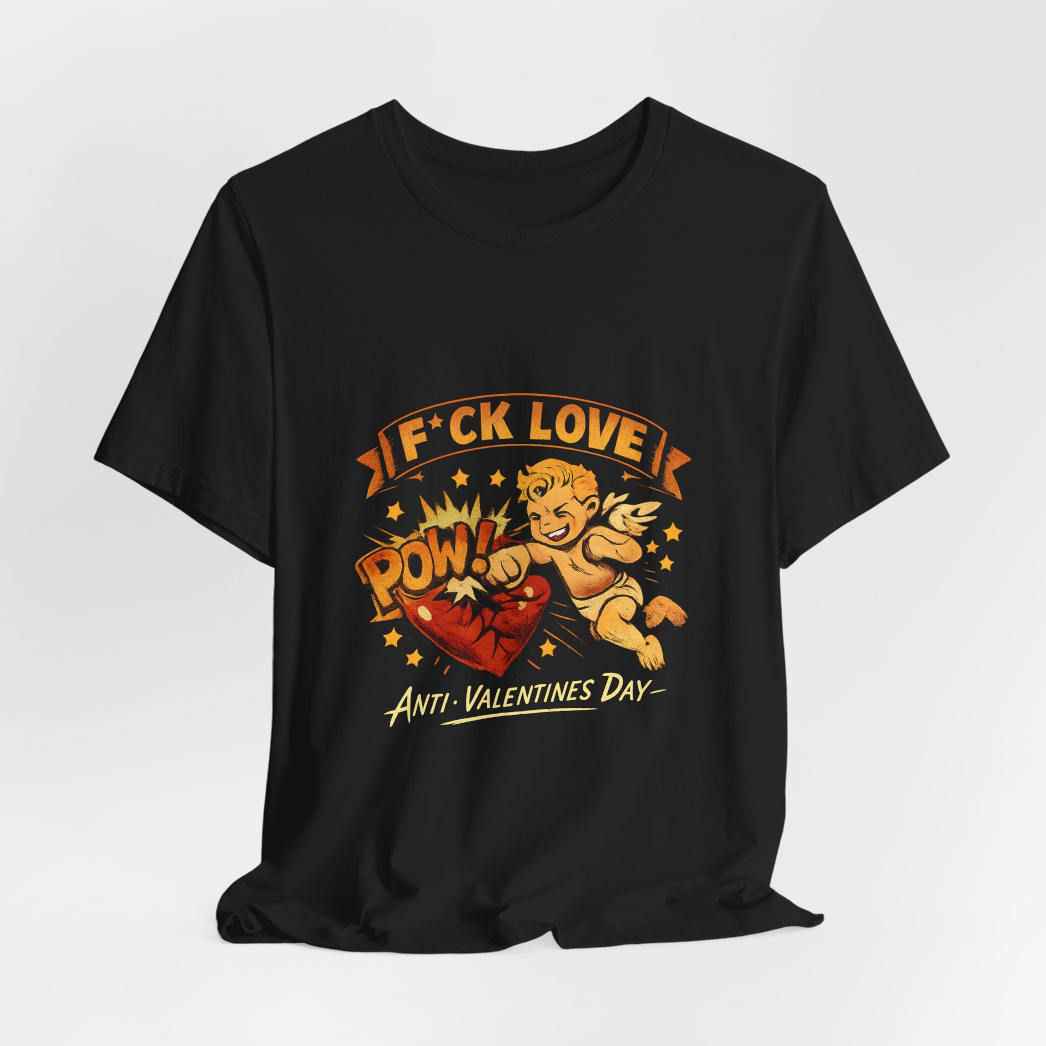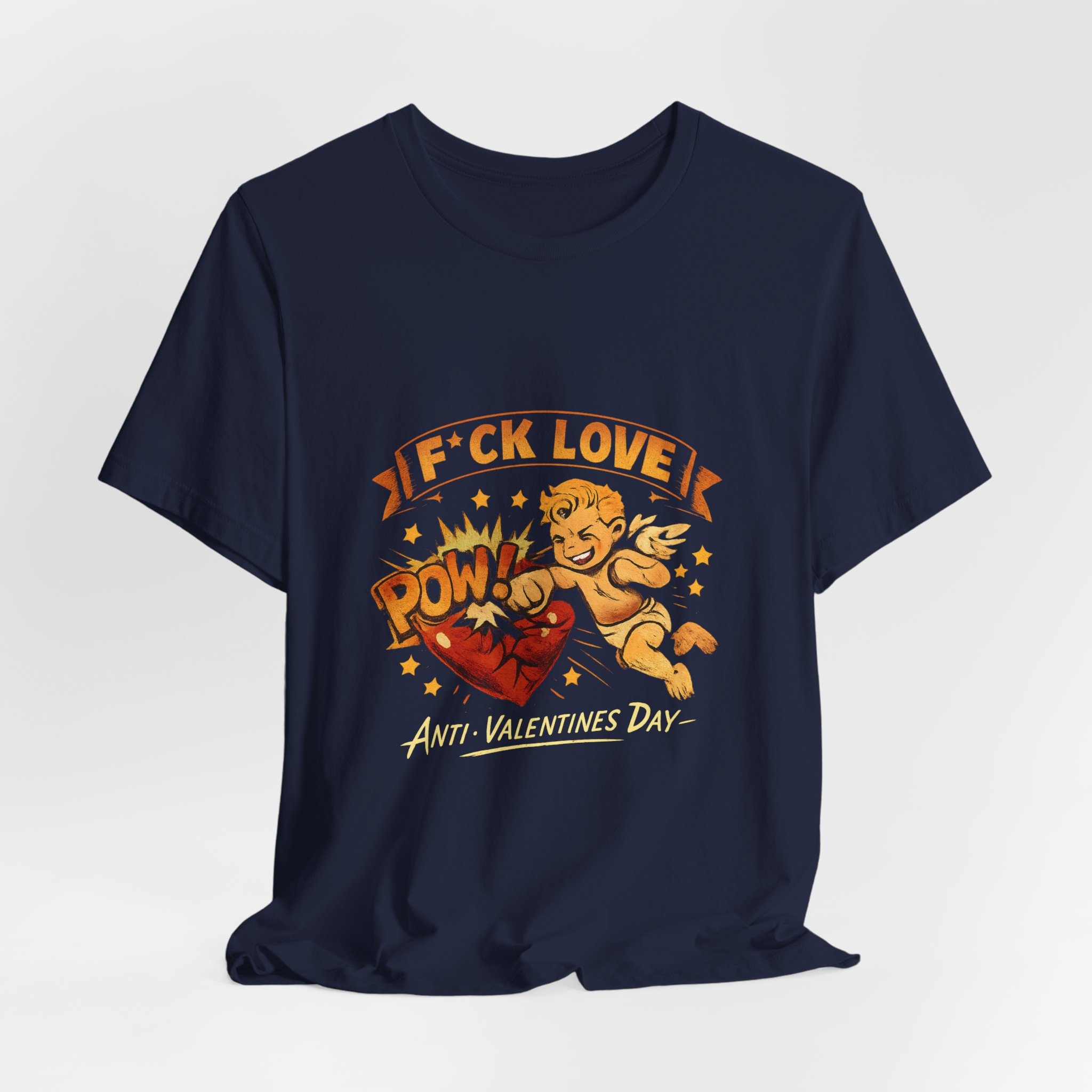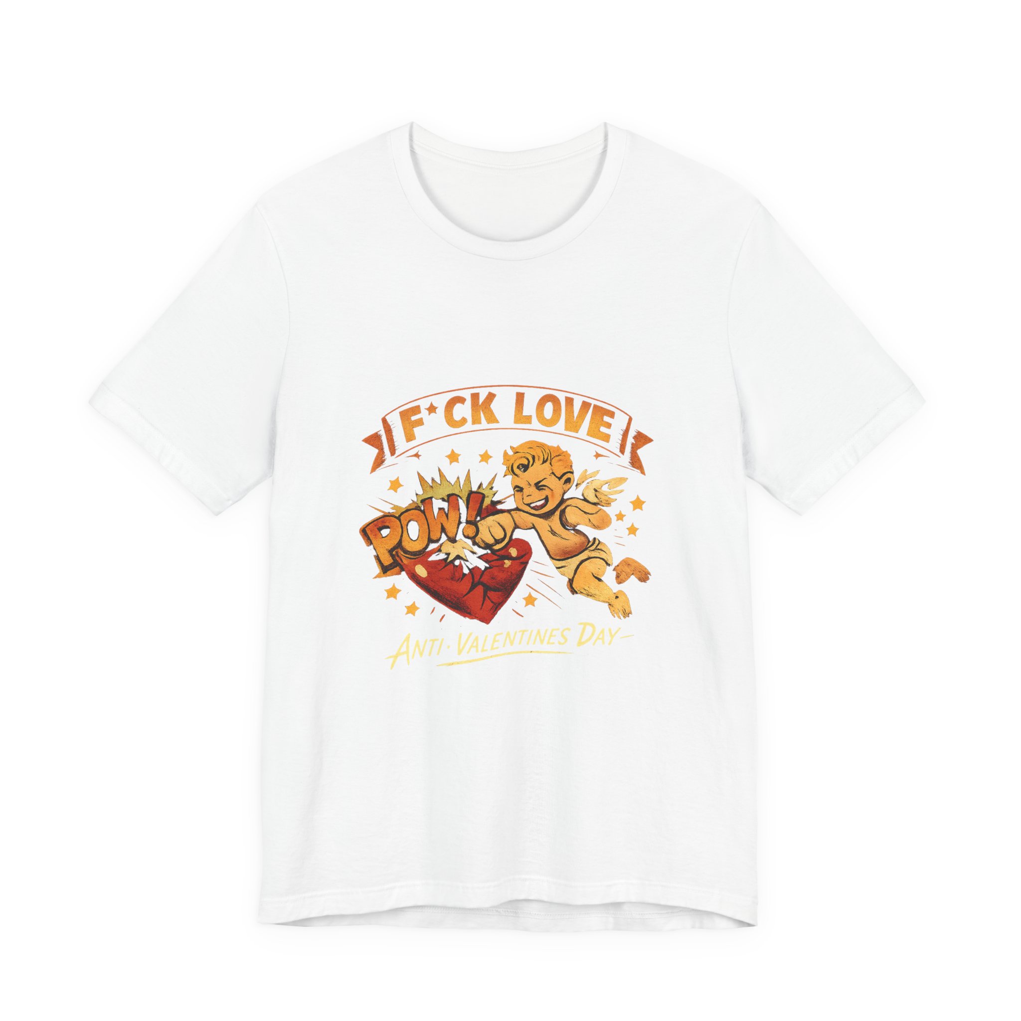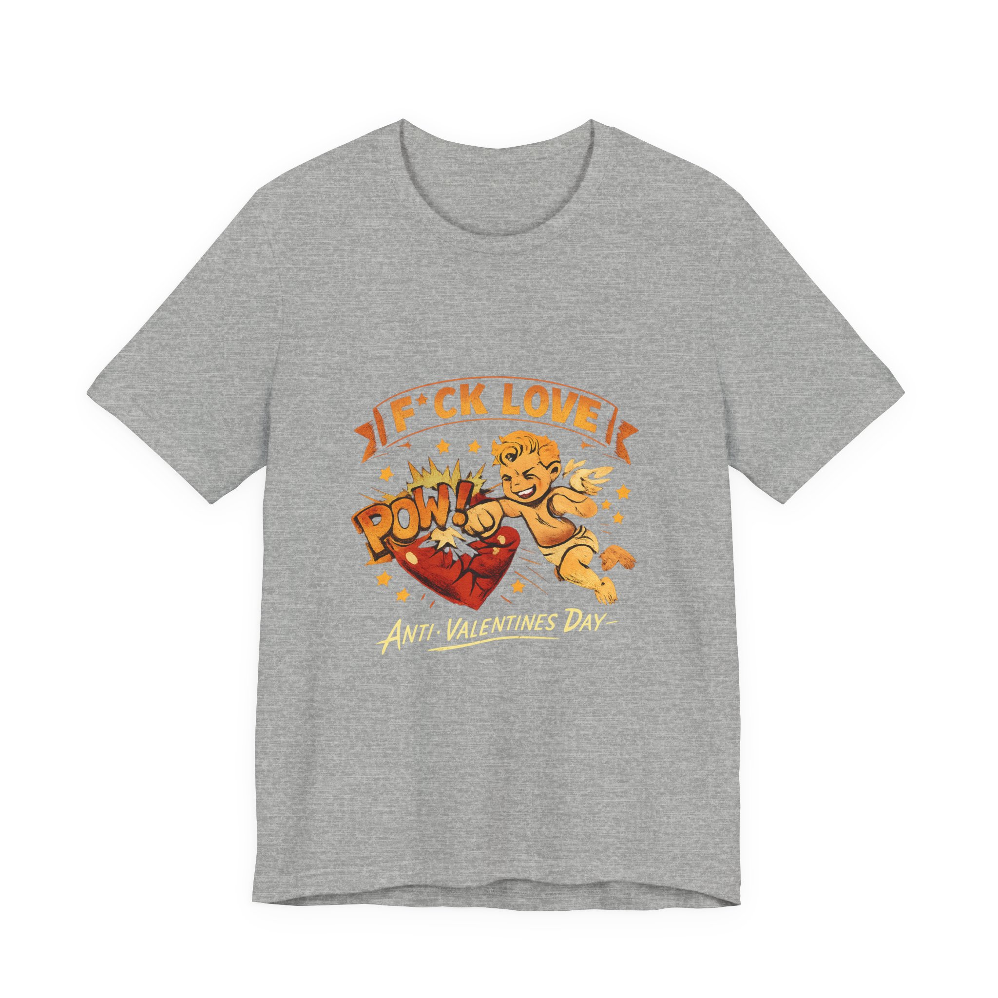 A satirical tee riffing on Modern Apocalyptic Humor: a vintage-style cherub smashing a heart with comic-book ‘POW’ energy, rendered in stark neutrals and warning orange accents. The design turns doomscroll tension into gallows levity—bold, utilitarian typography echoes alert graphics while the retro illustration softens the mood. Wear it to wink at cultural collapse and join a community that processes anxiety through ironic resilience.
